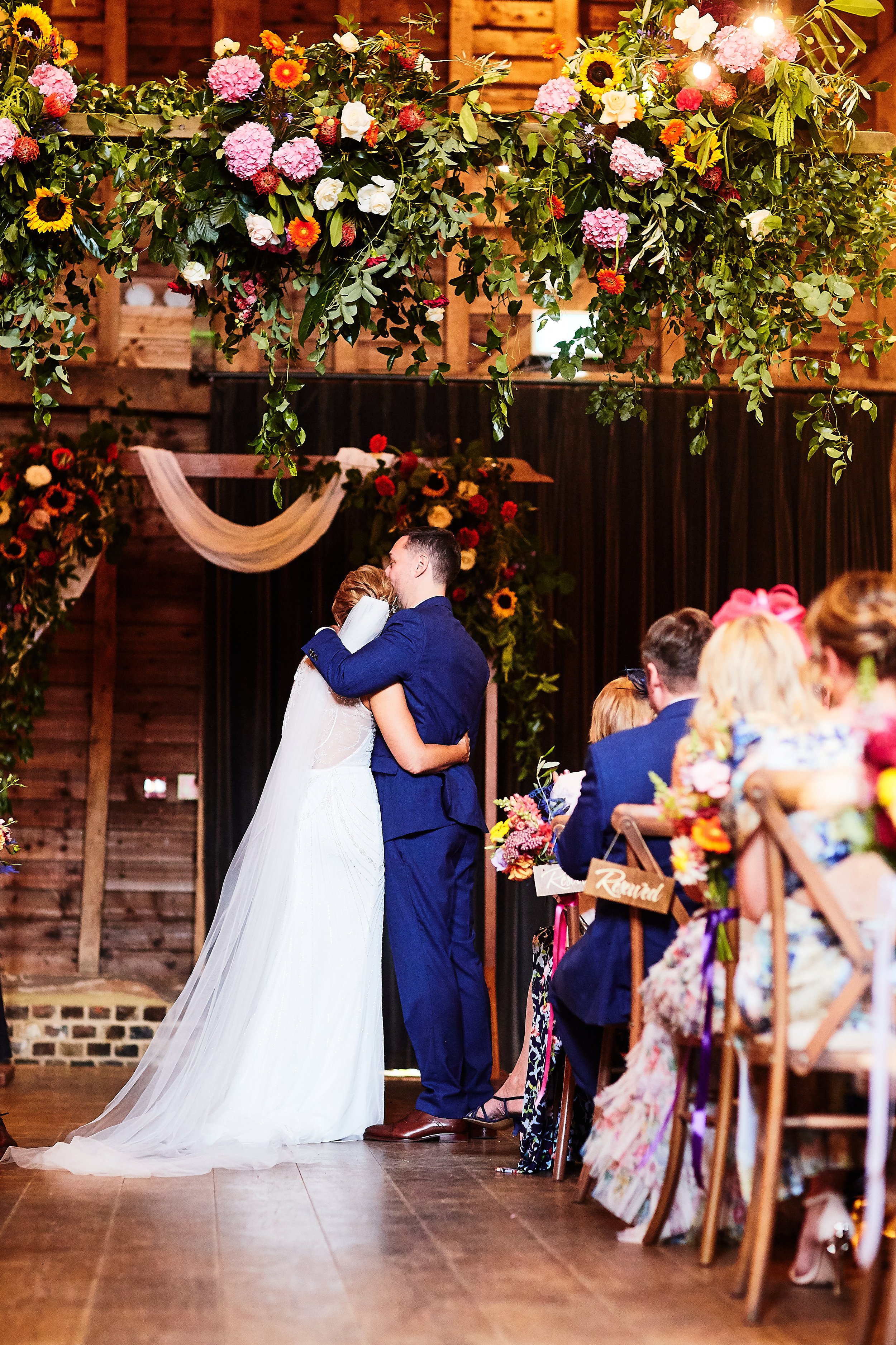 Jo and Tom’s wedding was truly one of my absolute favourite weddings this season. It was a delightful mix of fun and vibrancy, exuding beauty, brightness, and an overall atmosphere that was absolutely brilliant! The couple are lovely people, and it was such a joy to capture their special moments through my photography. Redcoats is an exceptionally stunning venue, offering something wonderful for everyone who visits. With its traditional rustic farmhouse feel, it lends itself beautifully to be dressed however you envision it. Whether you prefer a themed approach or a more stripped-back aesthetic, this venue remains picturesque in every regard. For this particular wedding, the couple chose a bright wildflower theme that was both charming and lively. The main barn featured a captivating hanging chandelier adorned with wildflowers, complemented by a striking wildflower arch and elegant floral arrangements on the tables. Shades of bright pinks, oranges, and cheerful sunflowers were thoughtfully incorporated throughout the décor. The wildflower bouquet theme was then beautifully echoed in the portraits we captured in the stunning wildflower field, which is conveniently situated behind the venue and gracefully leads out onto expansive fields and open landscape captured in the images below. The grounds are immaculately maintained, providing an idyllic setting for perfect pictures! Additionally, Jo and Tom included an Ice Cream Van and a Crazy Golf setup, which added an element of fun and excitement to the garden festivities, filled with laughter and joy.